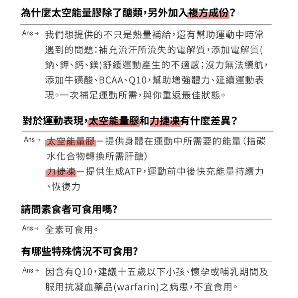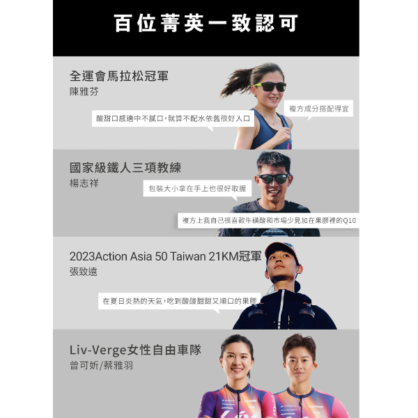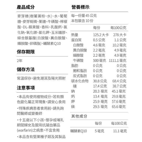 ・添加牛磺酸、BCAA及輔酶Q10:幫助增強體力耐力,提升整體運動表現。