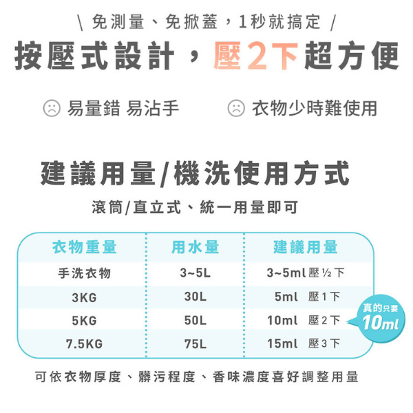 - 只要10ml洗整籃5公斤衣物,省時省力!