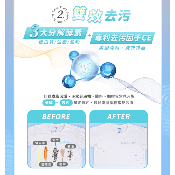 - 專利去污因子+酵素常見污垢輕鬆洗。